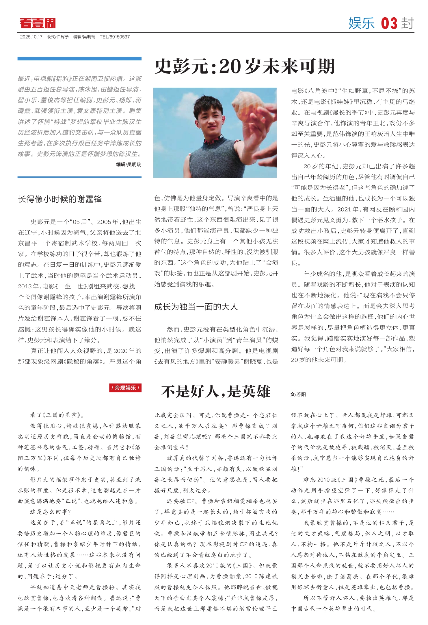 年少成名的他,是观众看着成长起来的演员。随着戏龄的不断增长,他对于表演的认知也在不断地深化。他说:“现在演戏不会只停留在表面的情感表达上。而是会去深入思考角色为什么会做出这样的选择,他们的内心世界是怎样的,尽量把角色塑造得更立体、更真实。我觉得,踏踏实实地演好每一部作品,塑造好每一个角色对我来说就够了。”大家相信,20岁的他未来可期。